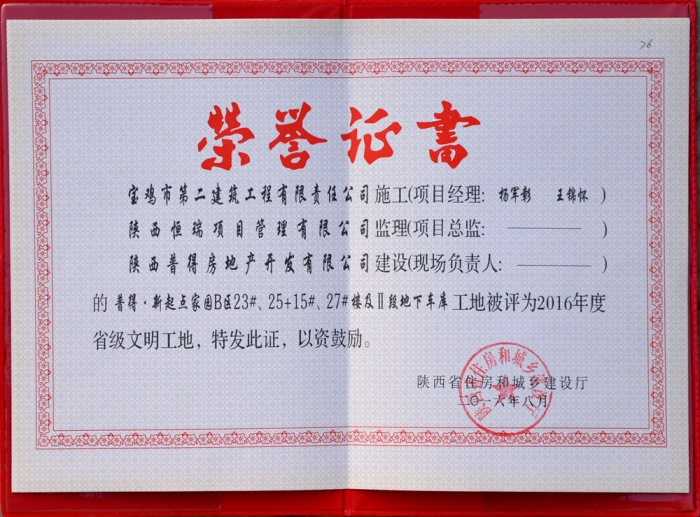2016年省級(jí)文明工地(西藏民族學(xué)院證書)