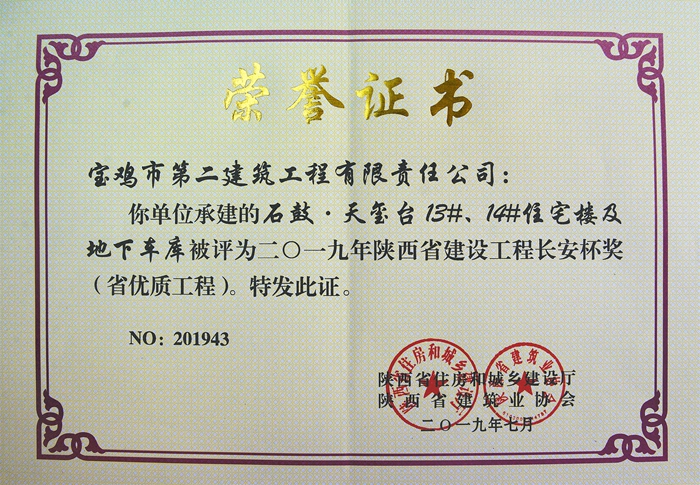 2019年陜西省建設(shè)工程長(zhǎng)安杯獎(jiǎng)(石鼓?天璽臺(tái)13#、14#住宅樓及地下車(chē)庫(kù))